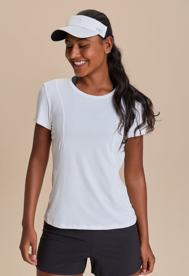 A Camiseta com decote redondo possui modelagem levemente solta ao corpo e recortes estratégicos que proporcionam um caimento ergonômico, valorizam a silhueta e permitem mais liberdade de movimento durante os treinos. Confeccionada em tecido leve e microperfurado, com tecnologia Quick Dry, que auxilia na absorção da umidade e mantém o corpo seco, e Easy Care, que reduz a necessidade de passar e facilita os cuidados diários. A exclusiva Assinatura LIVE! adiciona um toque de autenticidade ao produto.