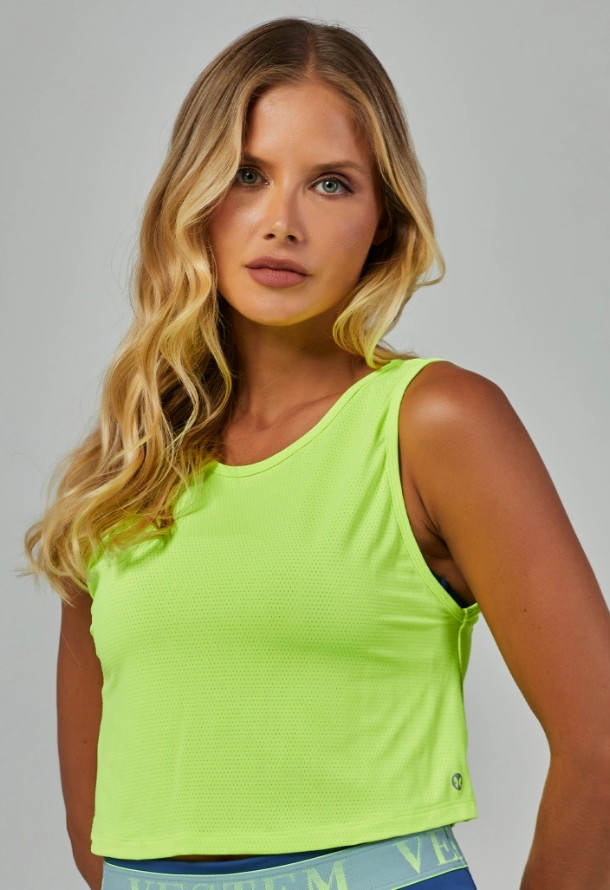 A Regata Dry Fit Bliss possui comprimento cropped e modelagem soltinha.