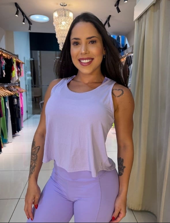 A Regata Dry Fit Hera possui comprimento cropped e decote redondo.